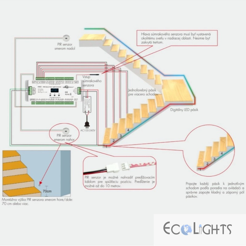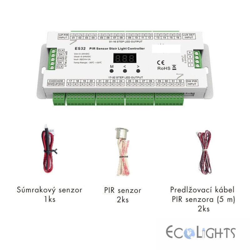 ES32 senzorový ovládač osvetlenia schodov je moderné riešenie pre efektívne a dynamické osvetlenie schodísk. Ovládač ponúka až 32 kanálov konštantného napätia s maximálnym prúdom 1 A na kanál, čo umožňuje samostatné riadenie každého stupňa. Je vybavený dvoma PIR senzormi (hore/dole) pre automatickú detekciu pohybu a senzorom denného svetla, ktorý zabraňuje spínaniu pri dostatočnom prirodzenom osvetlení.