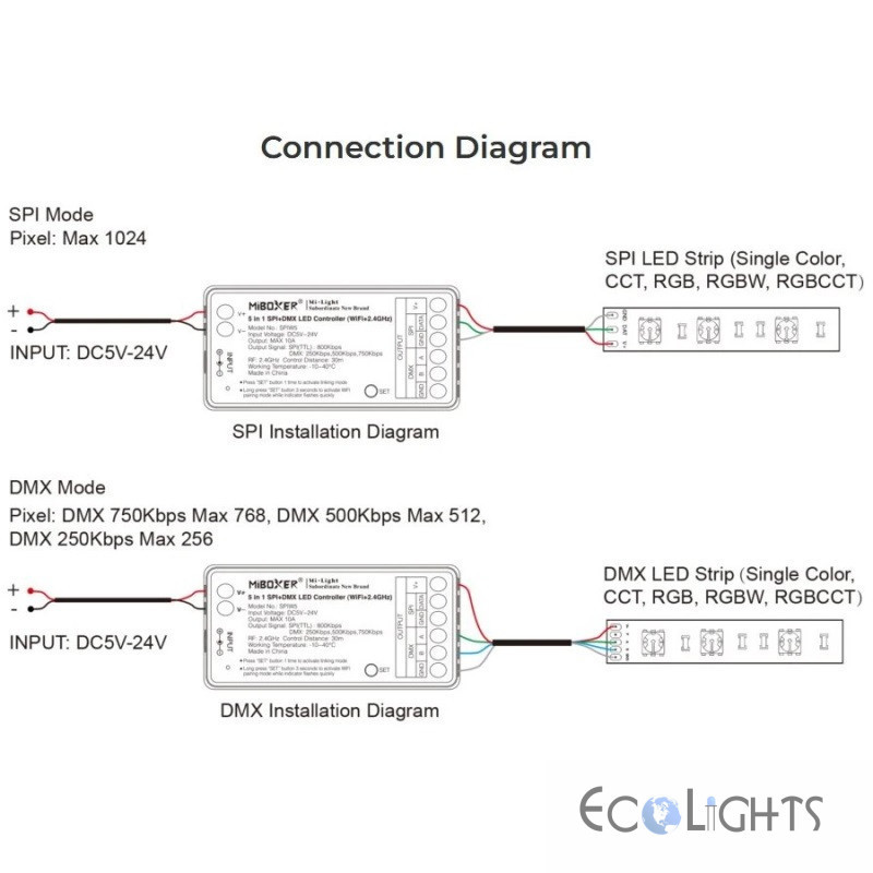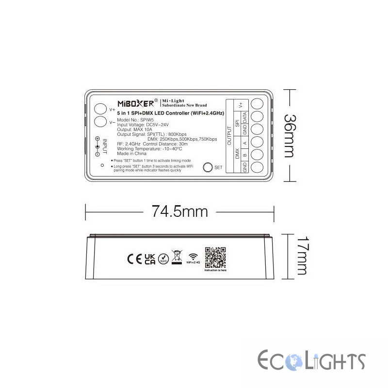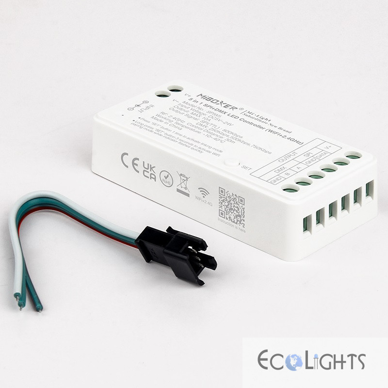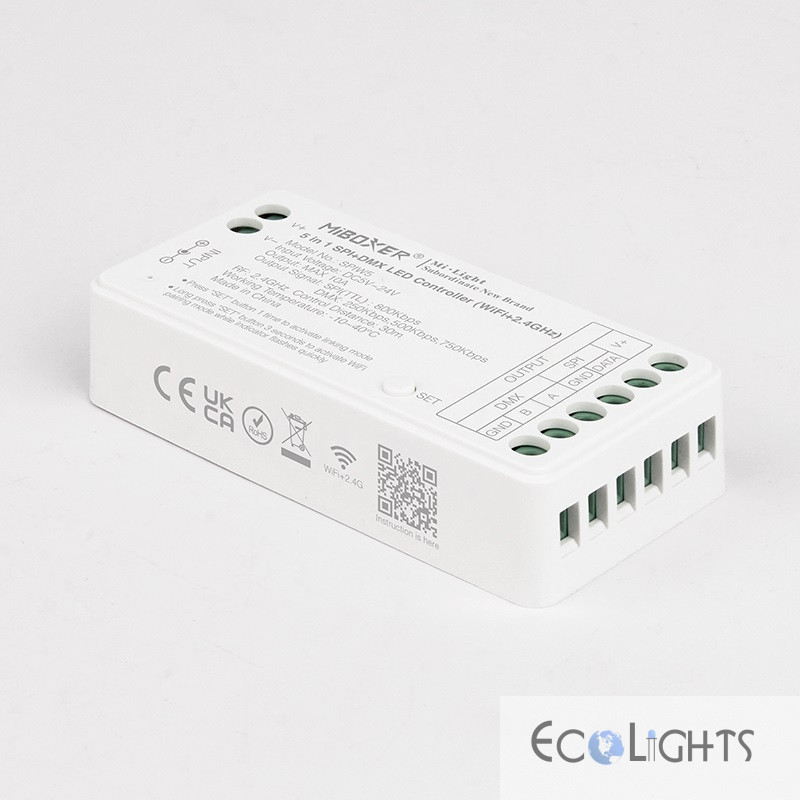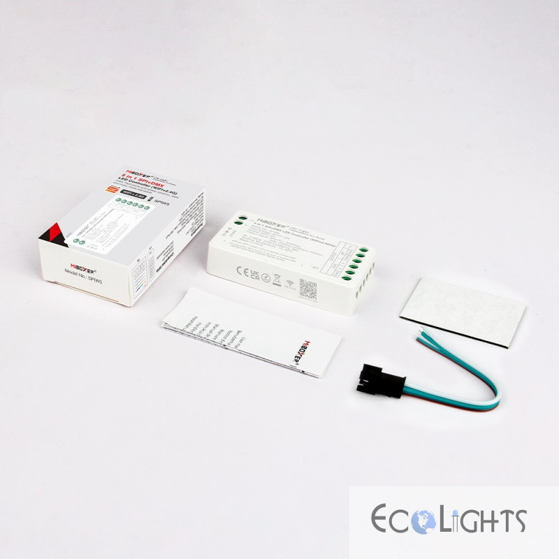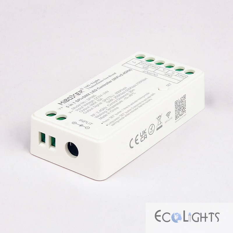 - Ovládač MiLight (Miboxer) SPIW5 je univerzálne zariadenie novej generácie určené na ovládanie digitálnych LED pásov (Magic Pixel) aj DMX osvetlenia. Vďaka kombinácii WiFi a 2,4 GHz RF technológie umožňuje pohodlné a flexibilné ovládanie svetelných efektov pomocou mobilnej aplikácie alebo kompatibilného diaľkového ovládača alebo nástenného ovládača. Tento 5v1 ovládač podporuje viacero protokolov SPI aj DMX a je vhodný pre náročné svetelné inštalácie v interiéri.