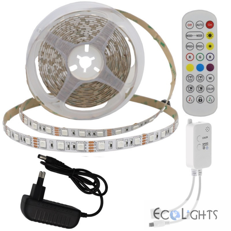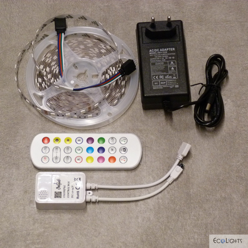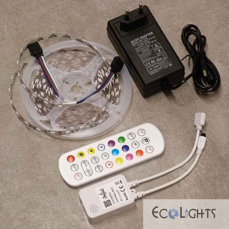 Sada dekoratívneho RGB LED pásu v celkovej dĺžke 5m s napájacím zdrojom a RGB ovládačom s diaľkovým ovládaním a ovládaním pomocou aplikácie. Je ideálna na akcentové osvetlenie alebo dekoráciu.