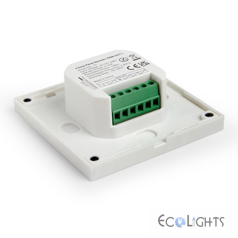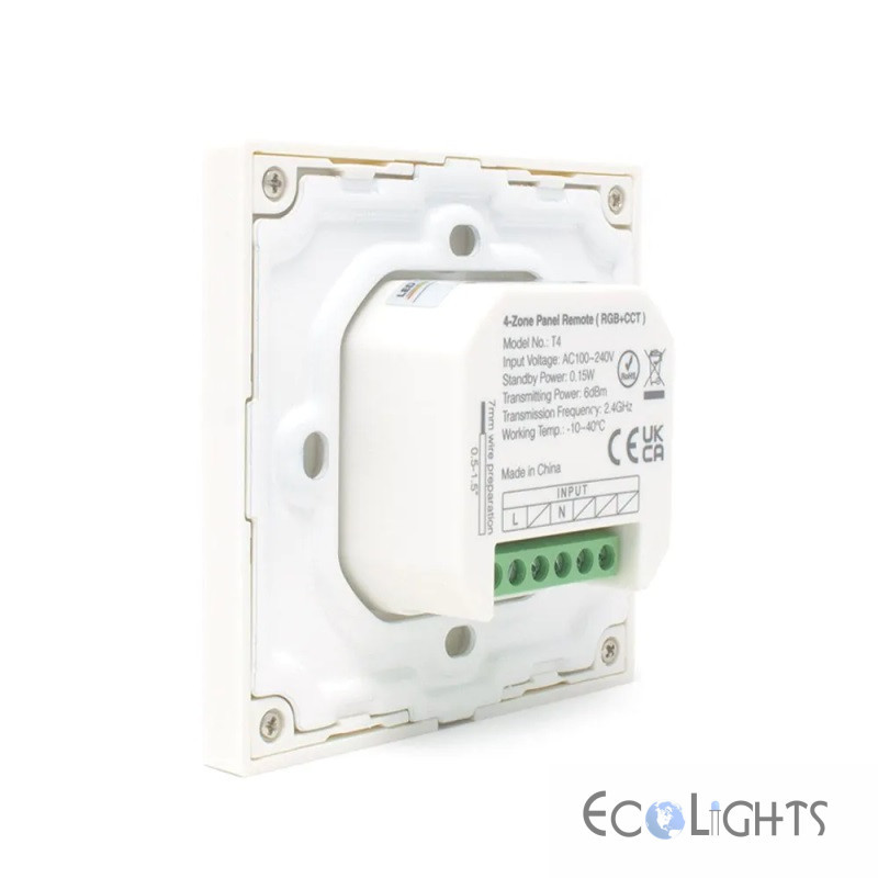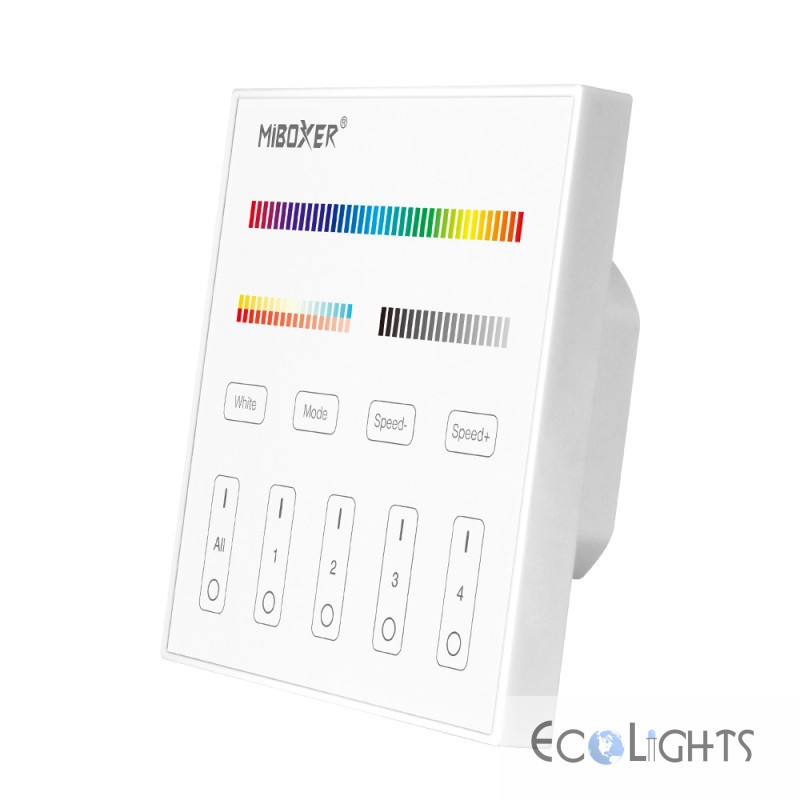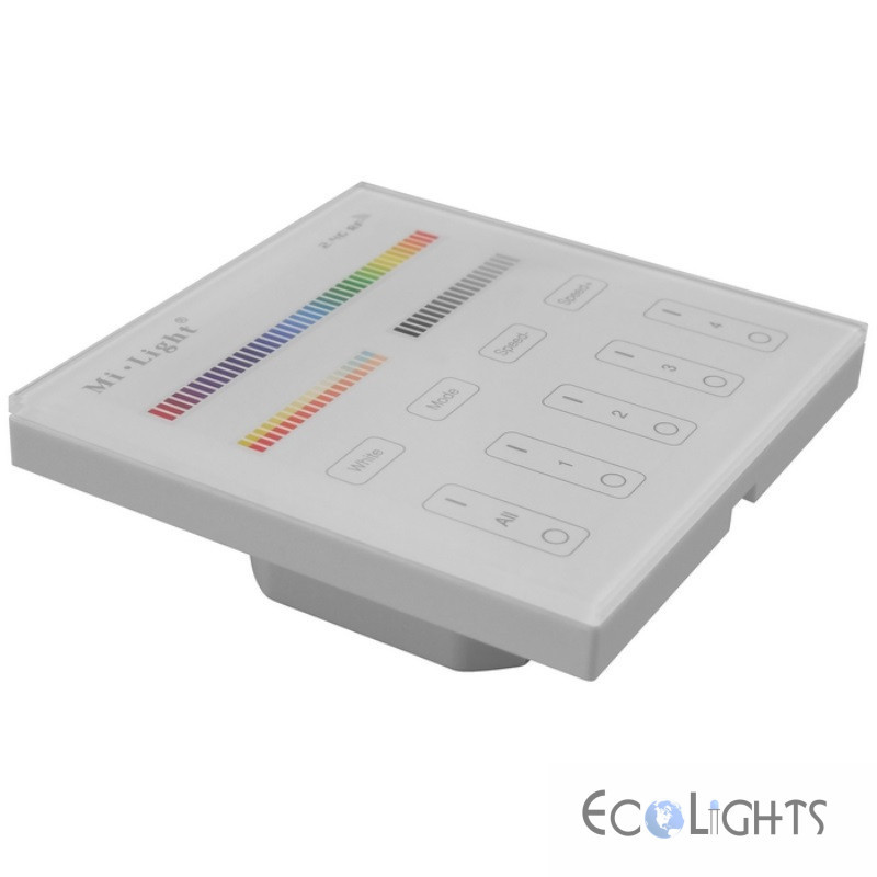 Nástenné ovládanie Touch Panel-T4 od firmy Mi-Light je štvorzónový ovládač pre svetlá, žiarovky a RF receptory Mi-Light. Umožňuje ovládať farbu svetla RGB, RGBW (s pridanou bielou zložkou) a CCT (aplikácie s možnosťou riadenia teploty bielej farby svetla)