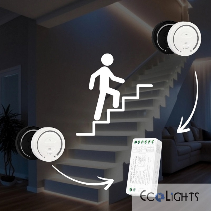 - Nástenný ovládač umožňuje ovládať 1 zónu osvetlenia, je ho možné ale kombinovať s ďalšími nástennými ovládačmi MiLight (napr. s dotykovým panelom stmievania B1 - 4-zóny) a tak ovládať jeden LED pás (žiarovku, svietidlo a podobne) z dvoch rôznych miest