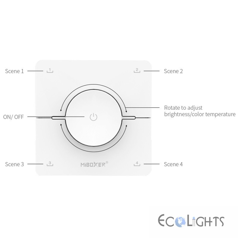 - Tento brilantne navrhnutý bezdrôtový 2,4 GHz RF nástenný ovládač je určený pre riadenie jednofarebných (MONO) a Dual-White (CCT) LED.